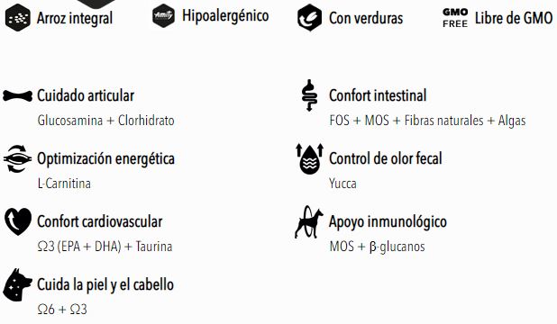 Carne deshidratada 36% (pollo 14%), arroz 27% (arroz integral 15%), guisantes 12%, grasa de ave 12%, harina de algarroba 2%, pulpa de remolacha 2%, proteína animal hidrolizada, vitaminas y minerales, levadura y extracto de levadura-Saccharomyces cerevisiae (Fuente de mananooligosacáridos – MOS y β-glucanos), aceite de salmón (Fuente de ac. grasos Omega-3), fibra dietética insoluble de guisante, Inulina (Fibra soluble de achicoria, fuente fosfooligosacáridos - FOS), salvia hispánica (fuente de ac. grasos Omega-3 y fibra dietética), algas (Ascophyllum nodosum), hidrolizado de crustáceos (Fuente de Glucosamina), hidrolizado de cartílago (Fuente de Condroitina), aceites esenciales (orégano, canela, clavo, tomillo, romero, hierbabuena, té verde), yucca.
