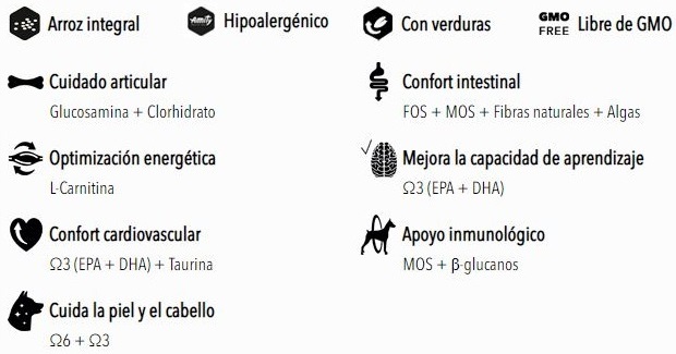 Carne deshidratada 39% (pollo 14%), arroz 24% (arroz integral 14%), grasa de ave 13%, guisantes 10%, harina de algarroba 2%, proteína animal hidrolizada, pulpa de remolacha, vitaminas y minerales, levadura y extracto de levadura-Saccharomyces cerevisiae (Fuente de mananooligosacáridos – MOS y ?-glucanos), aceite de salmón (Fuente de ac. grasos Omega-3), Inulina (Fibra soluble de achicoria, fuente fosfooligosacáridos - FOS), salvia hispánica (fuente de ac. grasos Omega-3 y fibra dietética), algas (Ascophyllum nodosum), fibra dietética insoluble de guisante, fibra dietética soluble extraída de Plantago ovata, hidrolizado de crustáceos (Fuente de Glucosamina), hidrolizado de cartílago (Fuente de Condroitina), aceites esenciales (orégano, canela, clavo, tomillo, romero, hierbabuena, té verde), yucca.