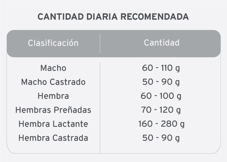 Proteína 30%, Grasa 9%, Humedad 12%, Fibra cruda 3%, Minerales totales 9%, Calcio (min) 1% (max) 2%, Fosforo (min) 0,6% (max) 1,2%