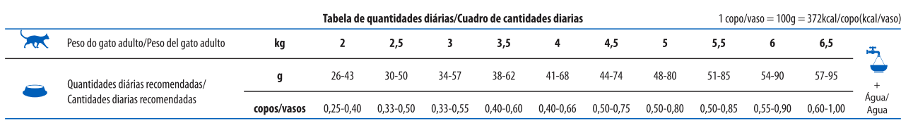 Proteína Bruta (mín.) 320g/kg (32%); Extracto etéreo (mín.) 120g/kg (12%); Humedad (máx.) 90g/kg (9%); Materia fibrosa (máx.) 30g/kg (3%); Materia mineral (máx.) 80g/kg (8.0%); Calcio (mín.) 8.000mg/kg(0,8%); Calcio (máx.) 15g/kg (1,5%); Fósforo (mín.) 9.000mg/kg (0,9%); Sodio (mín.) 2.000mg/kg; Potasio (mín.) 5.000mg/kg; Magnesio (mín.) 900mg/kg; Omega 6 (mín.) 15g/kg; Omega 3 (mín.) 2.500mg/kg; DHA (mín.) 575mg/kg; EPA (mín.) 480mg/kg; Fructo-Oligosacáridos (mín.) 400mg/kg; Manano-oligosacáridos (mín.) 240mg/kg; Metionina (mín.) 7.500mg/kg; Taurina (mín.) 2.000mg/kg; L-Carnitina (mín.) 100mg/kg; Lisina (mín.) 14g/kg; Sulfato de condroitina (mín.) 75mg/kg; Sulfato de glucosamina (mín.) 150mg/kg;